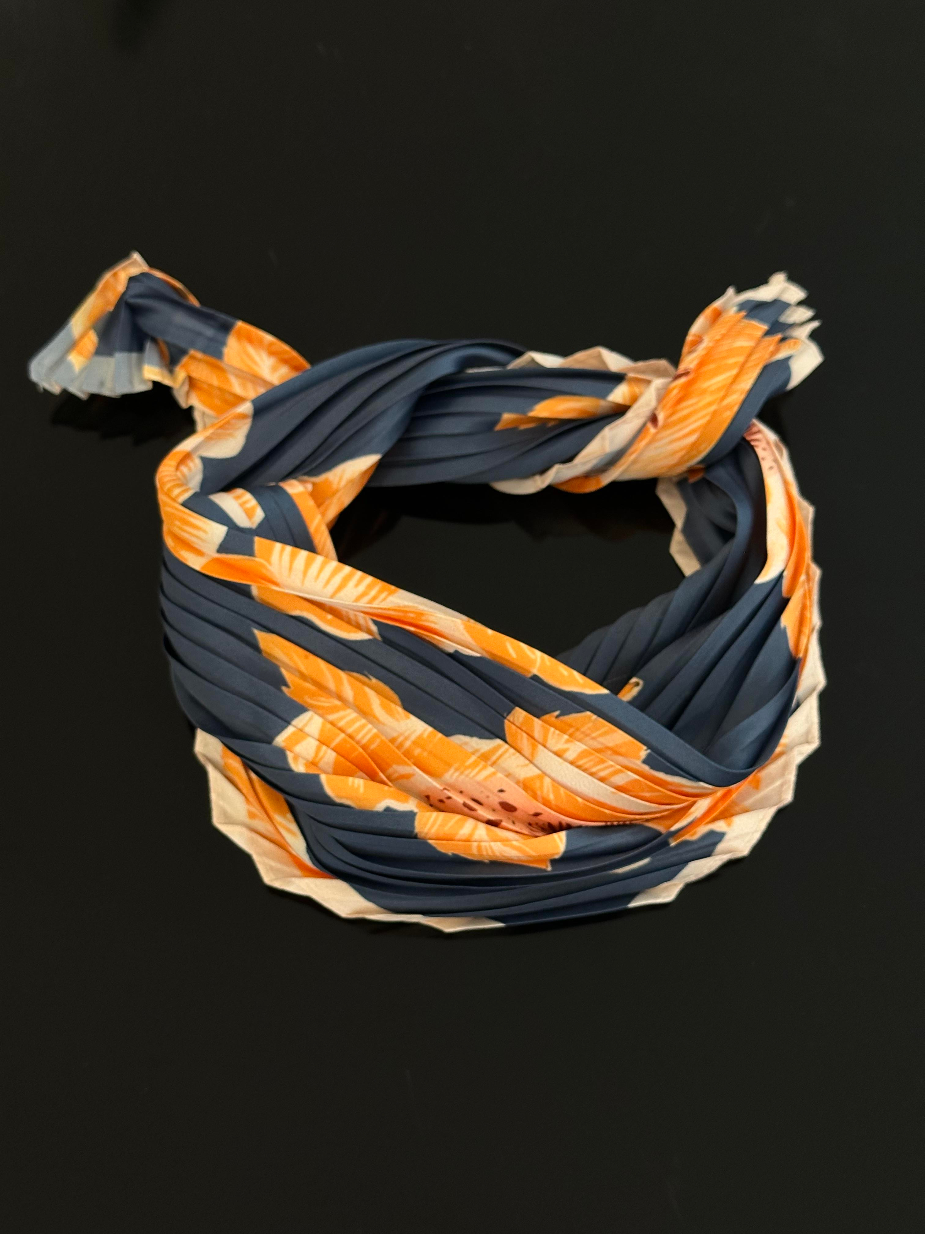 Lacivert & Turuncu Hazan Çiçek Desen Piliseli Saten Fular